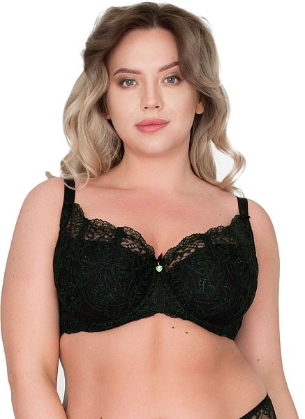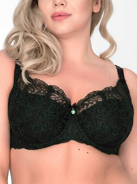 Бюстгальтер с чашкой +size на тонком поролоне и изысканной зелёной вышивкой